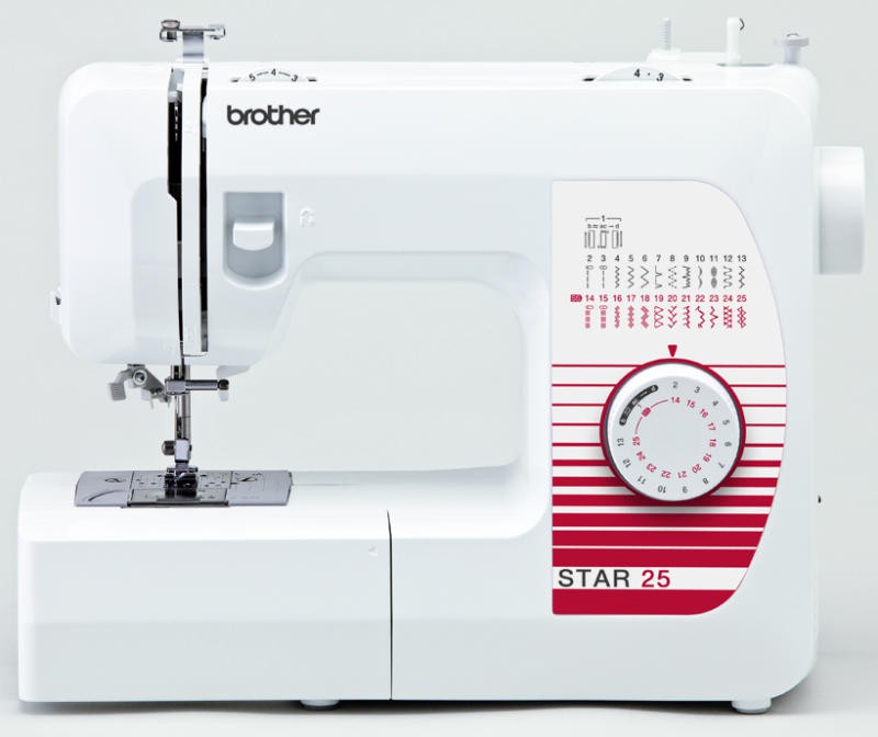 Швейная машина Brother Star 25. Выполняет 25 операций, имеет горизонтальный челнок, петля - полуавтомат. В комплекте у Brother Star 25 - 4 лапки. Есть нитевдеватель.