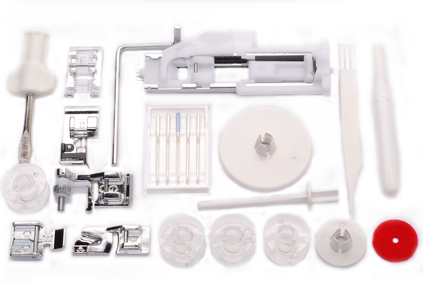 В комплекте Лапка универсальная, Лапка для пришивания молнии, Лапка для выметывания петли-автомат, Оверлочная лапка, Лапка для потайного шва,Лапка подрубочная, Лапка прозрачная для декоративных строчек, Направитель ткани, Набор шпулек., Набор игл, Вспарыватель, Большая отвёртка, Кисточки, Дополнительный катушкодержатель, Держатель для катушки (большой, малый),Фетровая прокладка под катушку, Жесткий чехол