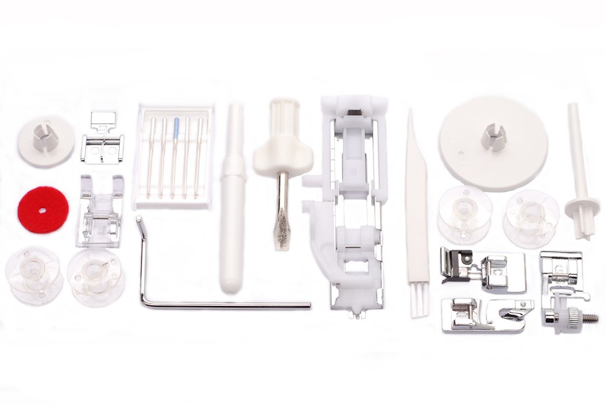 В комплекте Универсальная лапка, Лапка для вшивания молнии, Лапка для выметывания петли-автомат, Оверлочная лапка, Лапка для потайного шва,Лапка подрубочная, Лапка прозрачная для декоративных строчек, Направитель ткани, Набор шпулек (4 шт.), Набор игл, Вспарыватель, Большая отвёртка, Кисточка, Стойка для катушки, Держатель для катушки (большой, маленький),Фетровая прокладка под катушку