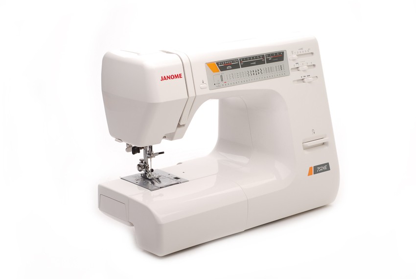 Швейная машина Janome 7524Е имеет горизонтальное челночное устройство, плавную регулировку скорости, выполняет 24 строчки. Имеет в комплекте  7 лапок, нитевдевающее устройство, подсказки.